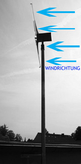 Der Breeze Breaker LW 550 kann wunderbar einfach installiert werden. Entweder durch das Dach am Dachstuhl oder durch den Dachvorsprung seitlich an der Hauswand unter dem Giebel. Am besten wird der Stahlrohrmasten mit 3 Rohrschellen an die Hauswand oder Dachstuhl geschraubt. Als Durchführung durch die Dachziegel gibt es Manschetten, damit es durch den Dachziegel nicht durchregnet. Das gibt es beim örtlichen Dachdecker. Sie dürfen je nach Gemeinde oder Bundesland einen bis zu 10 m hohen Masten vom Giebel weg gemessen anbringen, ohne Genehmigung oder Anmeldung. Wobei eine Drahtseilspannung ab 3 m Mastenhöhe notwendig wird. Wenn der Mast nur 2,5 bis 3 m über den Giebel steht, reichen die 3 Rohrschellen leicht aus. Das Windrad wiegt ja nur ca. 13,8 kg. Der Adapter für den 60 mm Masten ist bereits dabei.